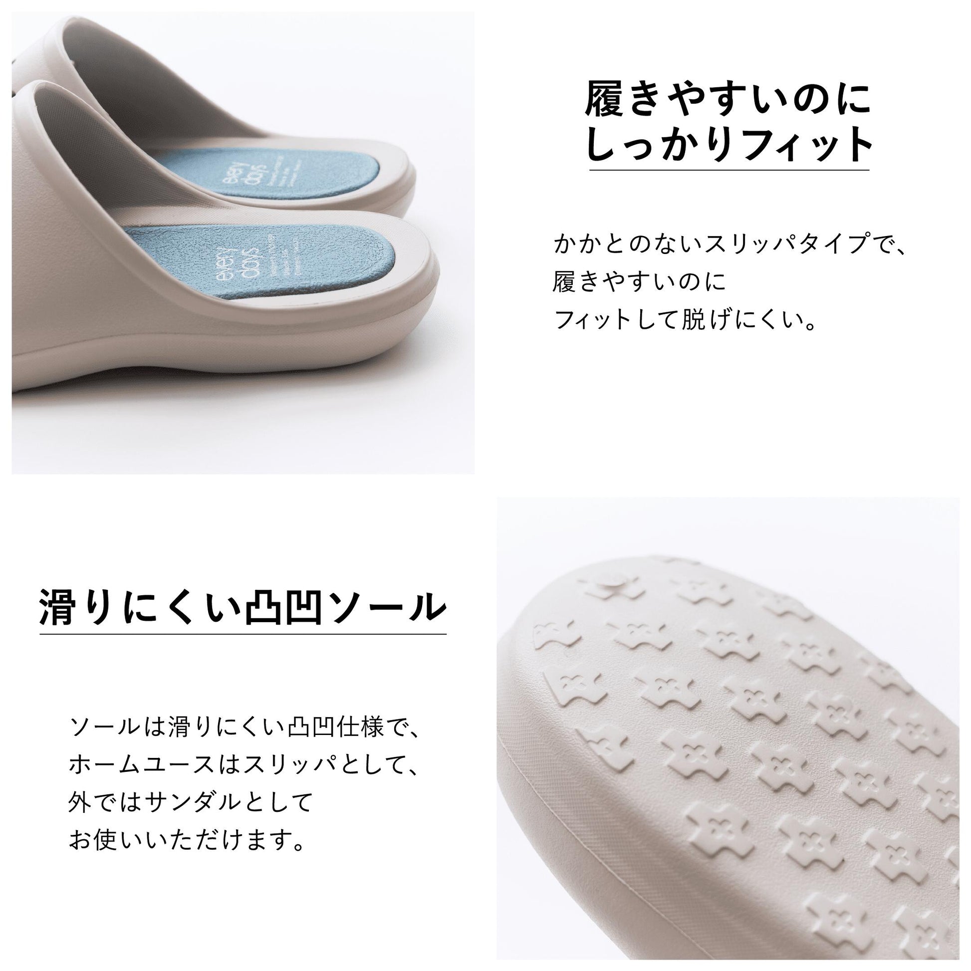 ・ソールは滑りにくい凸凹仕様で、ホームユースはスリッパとして、外ではサンダルとしてお使いいただけます。