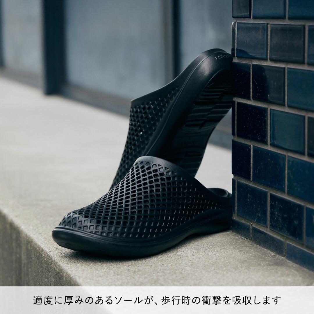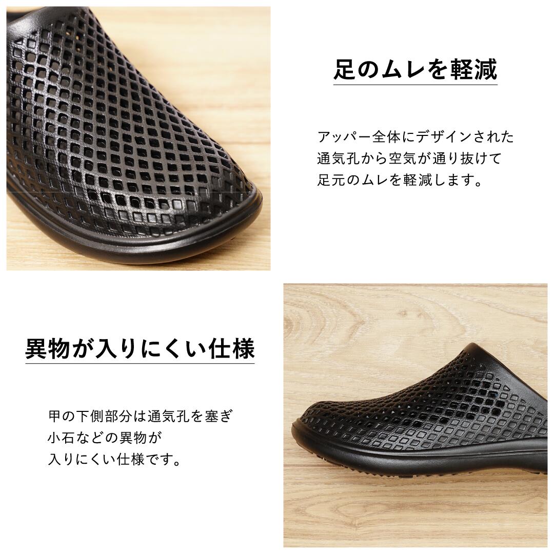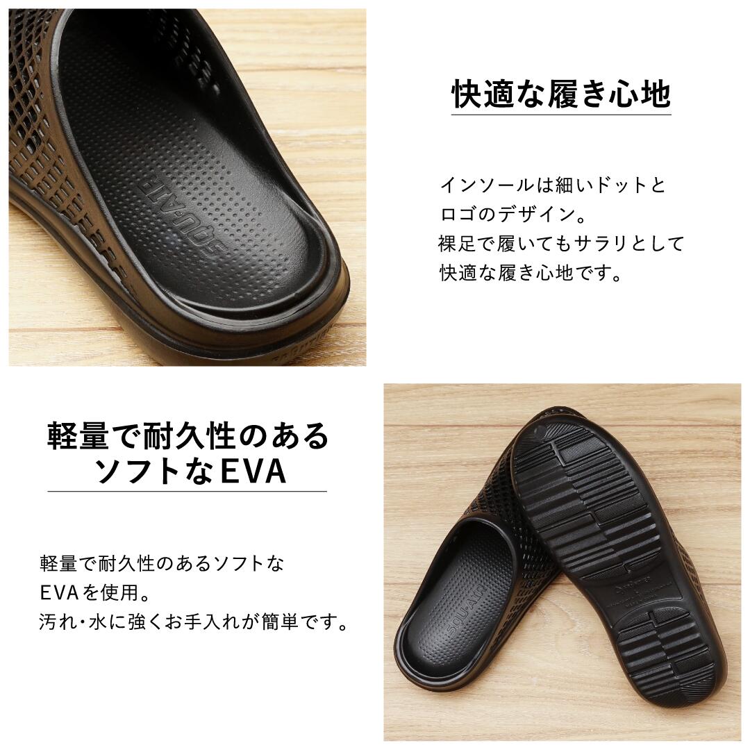 EVA素材を採用しており、柔軟で軽量、かつ適度な厚みのあるソールが歩行時の足裏の衝撃を吸収します。汚れても丸洗いが可能で、乾きやすく衛生面も◎。