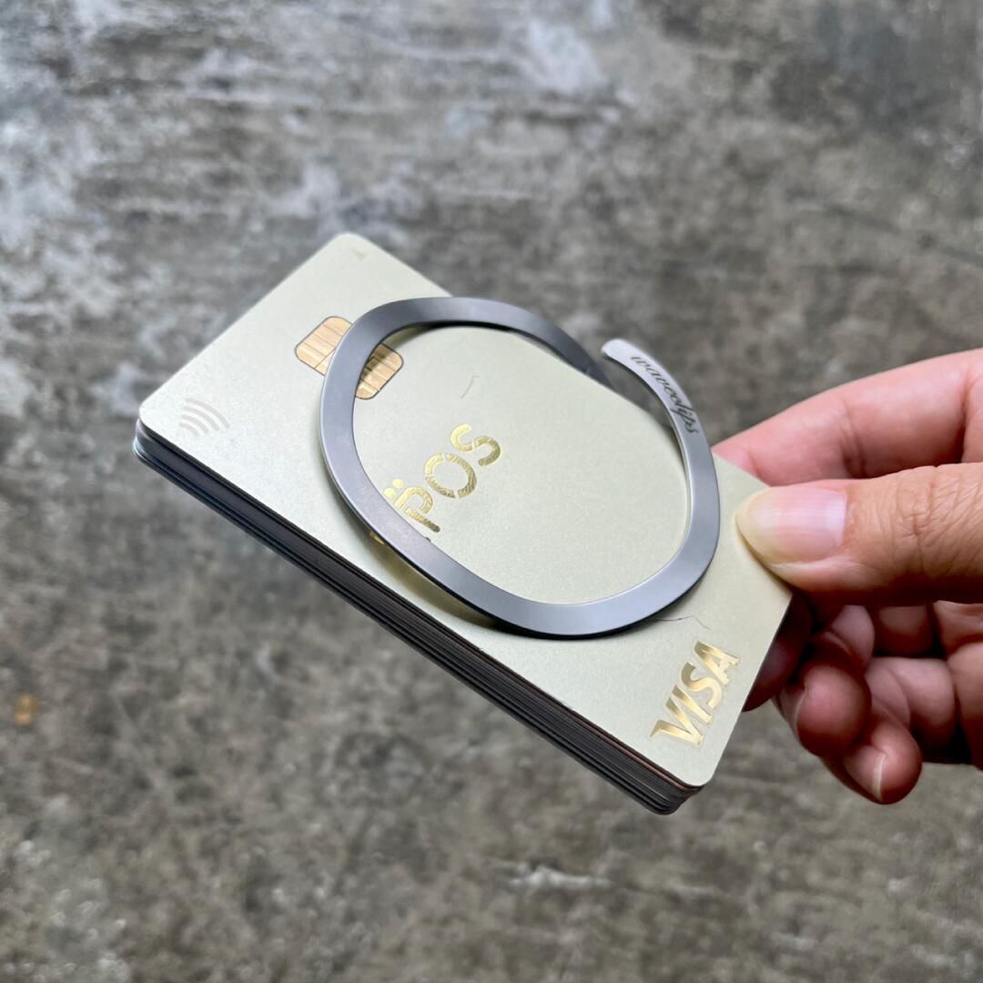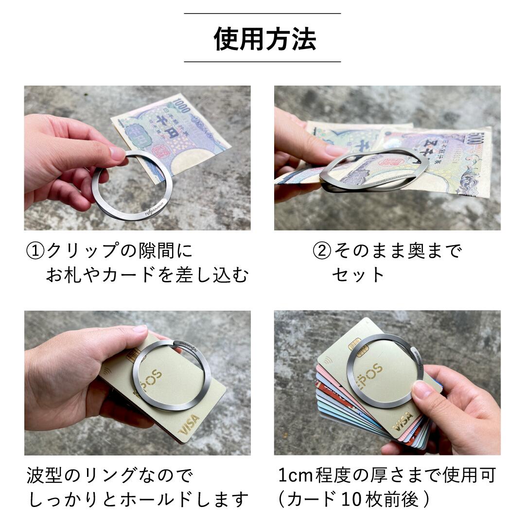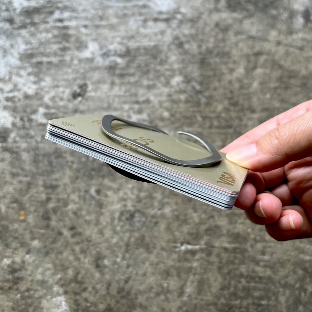 リングのスキマからお札やカードをスムーズに差し込める MONEY CLIP です。
